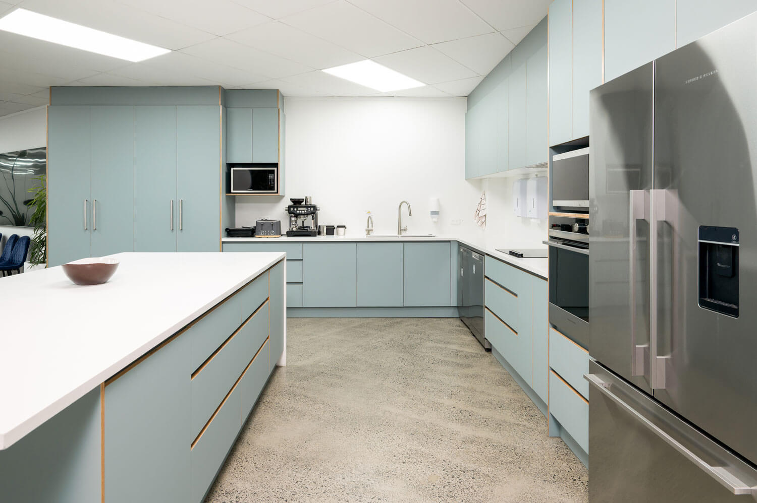 A complete commercial office transformation in Eden Terrace that turned a dated workspace into a modern, light-filled environment with thoughtful collaborative spaces.