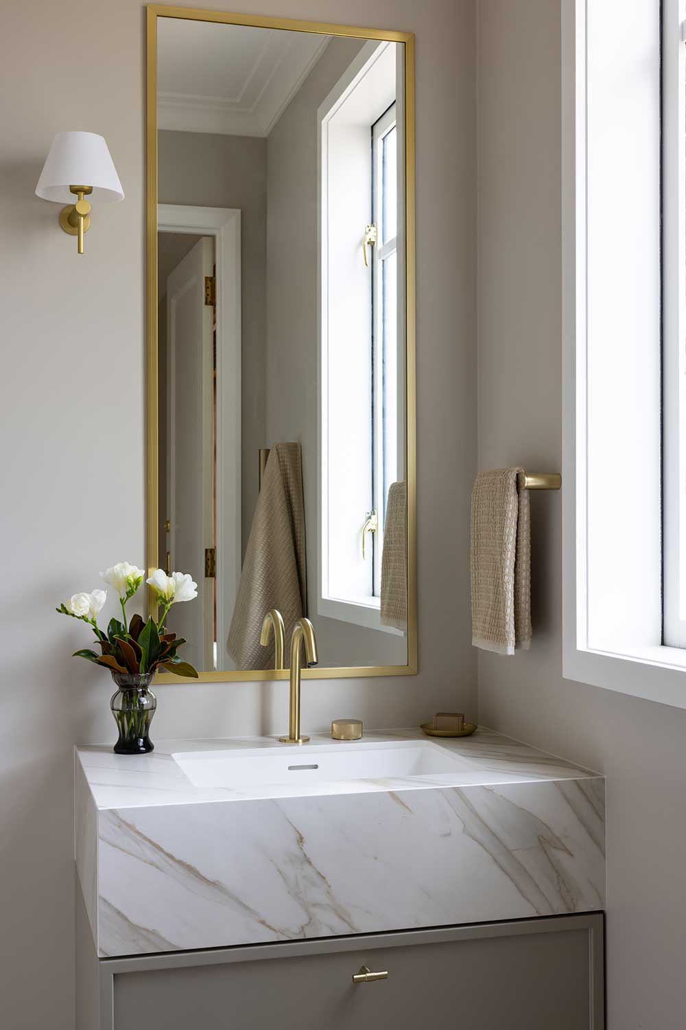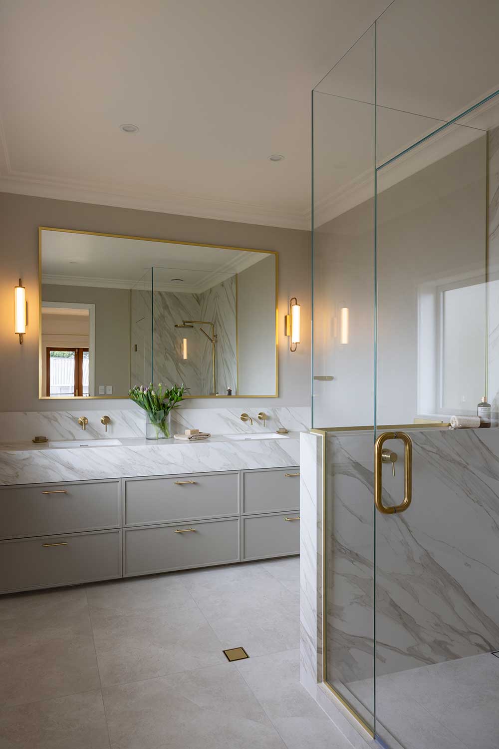 Every vanity in this project is custom made. A couple were framed up and lined by our team directly on site, then fitted with benchtops and understated brass hardware. Each one was designed to suit its specific space – and built to last.