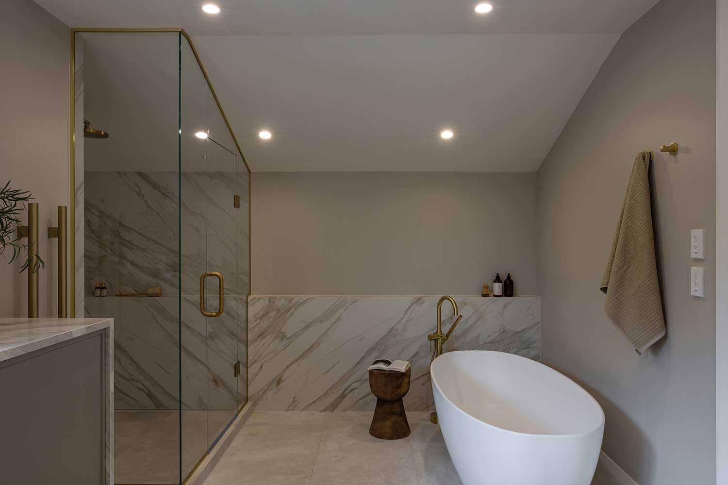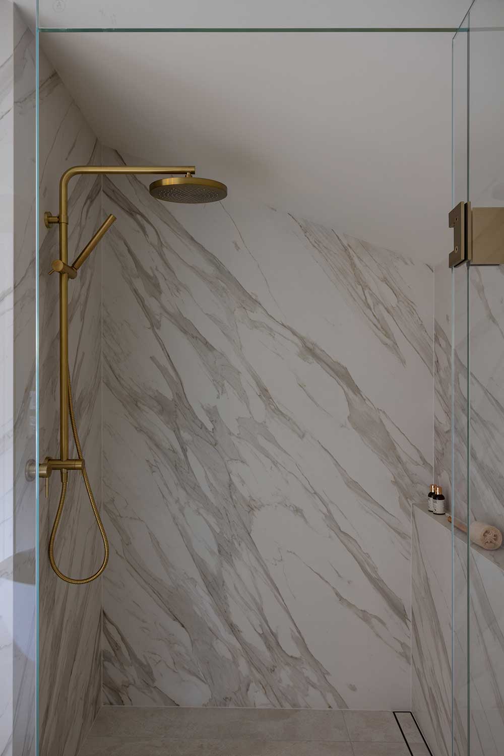 Our favourite detail on this project is the angled shower in the main ensuite. Rather than working against the existing roof structure, the design leans into it – a frameless glass enclosure that follows the roofline. It's not something you see every day, and it works beautifully.