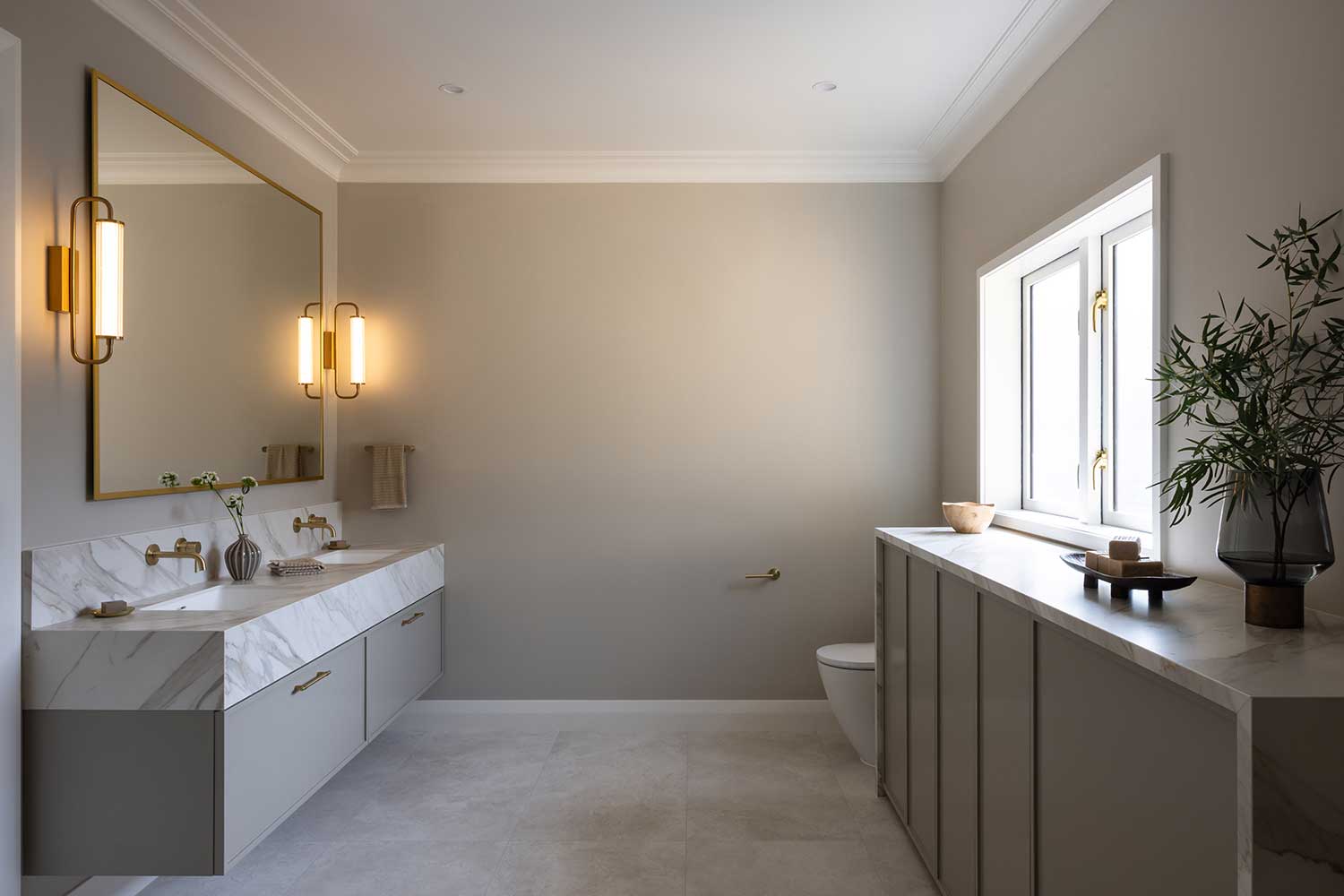 The design called for a palette of warm neutral tones, large-format tiles, and brushed brass tapware and hardware carried consistently through every room. Our job was to bring that vision to life across all six spaces – and to make sure every detail was executed to the standard it deserved. The result is a series of rooms that feel calm, considered, and distinctly connected.